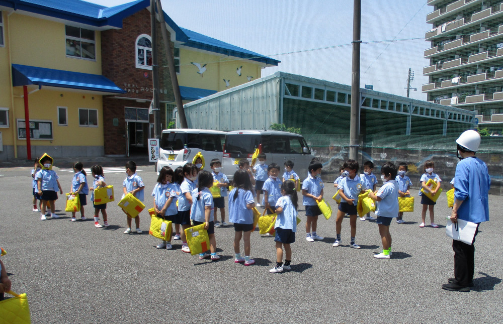 - 園外へ避難する場合、道路の冠水状況により近くのマンションへの避難が困難な時は、焼津高等学校への避難を考慮します。また、暴風雨などで歩行が困難(危険)な時は、通園バス(2台)の使用を考慮します。