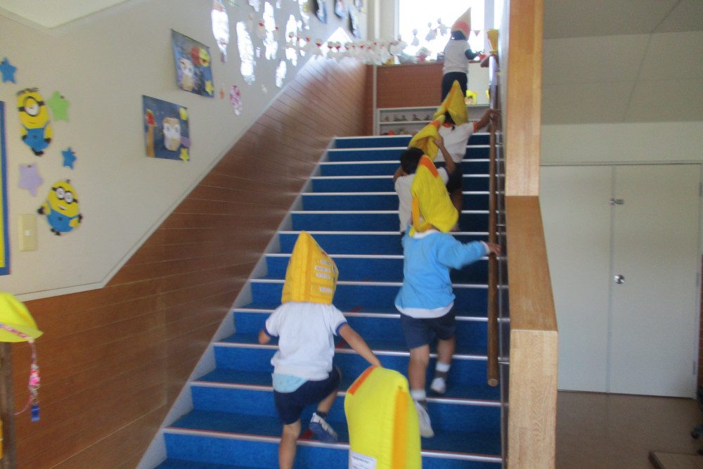 - 洪水時の状況により、浸水被害が予想された場合は、園舎2階ホールで待機します。