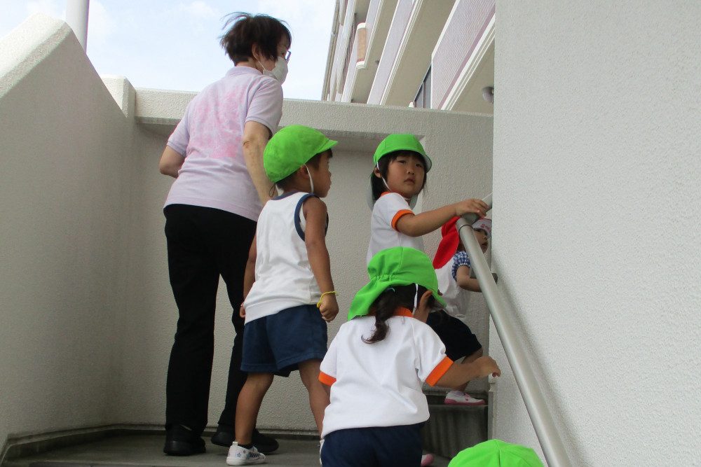 - 情報収集後、園舎2階では危険と判断し、園外への移動が可能な場合は早急に近くのマンション(4階以上)へ避難します。なお、近くのマンションへの避難は、状況により安全な出入り口(出入口2ヶ所を避難経路として利用しています)を判断し、誘導します。