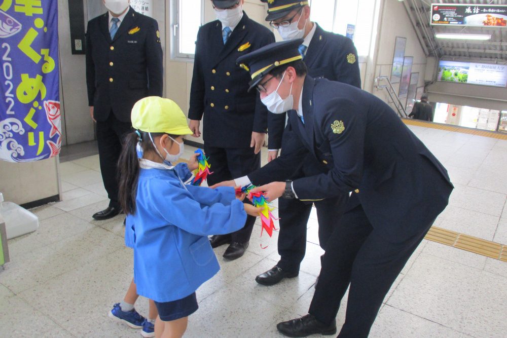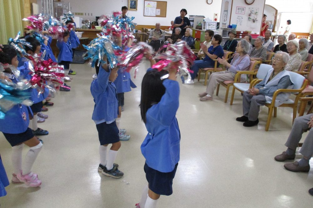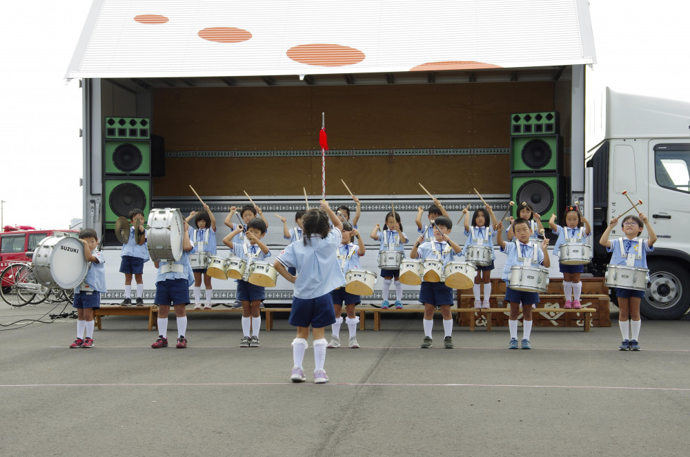 老人ホーム訪問や園外清掃のほか、自治体・自治会の催し物に鼓隊の演奏や踊りを発表したり、市の公共施設や地元のお店に折鶴をプレゼントするなど、積極的に地域との係わりを深めています。