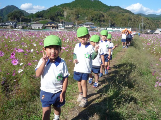 コスモスを見にいこう!! 2012年11月02日 共通 10月29日(月)に岡部町殿にあるコスモス畑へ行って来ました 畑全体に広がったコスモスはとてもきれいでした 幼稚園に帰ってきた年少さん、年中さんは 「た~くさん 咲いてきれいだったよ」など大満足の様子でした。 お天気も良く、コスモス畑の中をお散歩。 とても気持ちよかったね。