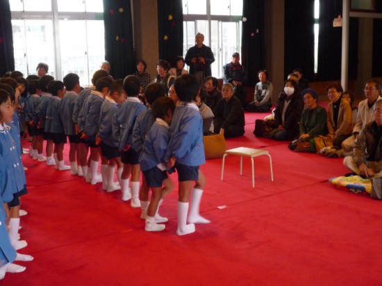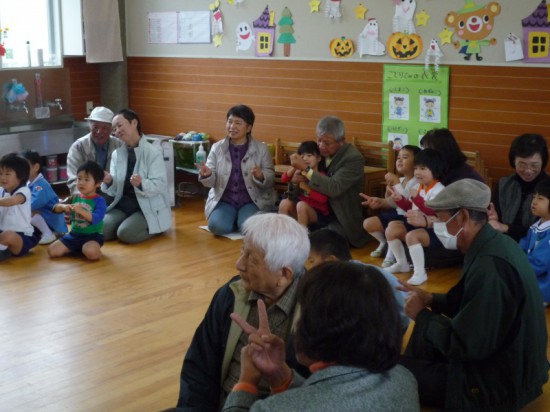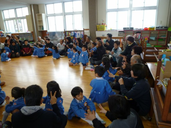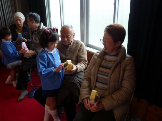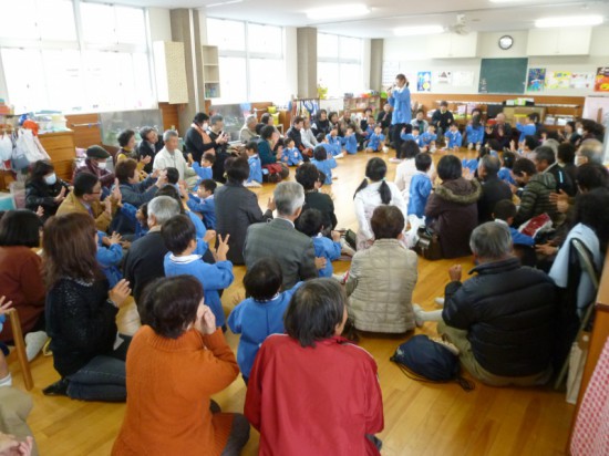 ☆「お客様の日」☆ 2012年11月26日 共通 11月23日(金)に「お客様の日」として、おじいさん、おばあさんや来年度の新入園児を お招きして、劇や歌、合奏を披露しました 子どもたちも毎日一生懸命練習してきた成果をおじいさん、おばあさんに見せることが出来ました 発表の後は各学年ごとにおじいさん、おばあさんとのふれあい ゲームや歌のプレゼントなど、とても楽しい時間を過ごしました。 最後に感謝の気持ちを伝え、プレゼントを渡しました。とても喜んでもらうことができ、 子どもたちもとても満足した様子でした。