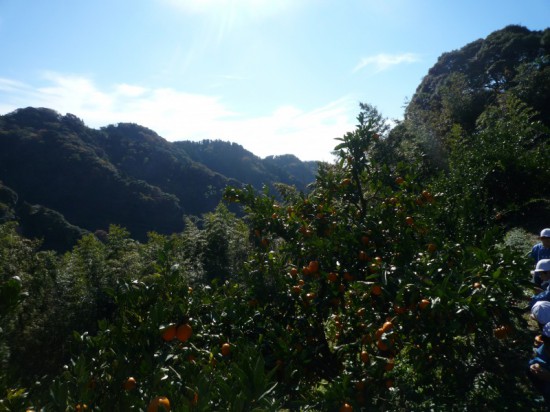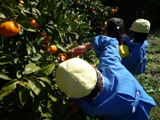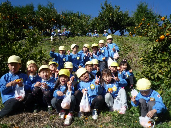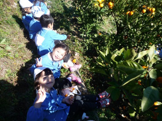 みかんがりに行ってきたよ ★ 2012年12月07日 年長 12月6日(木)に野秋のみかん畑に行ってきました 園バスでトトロが出てきそうな山道を登り、 たどり着いた所からは焼津の景色が一望できるスポット みんなでみなと幼稚園まで届くように大きな声で「ヤッホーーー」 その隣の畑にはオレンジ色に輝くみかんがたくさん 1人1つ専用のハサミを貸して頂き、枝からチョッキンと切って食べたみかんは最高 あっという間にぺろりとたいらげた子どもたちです