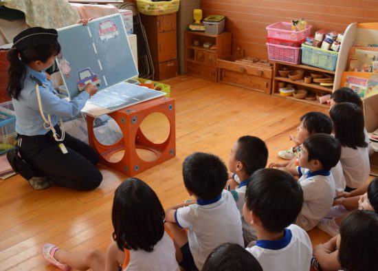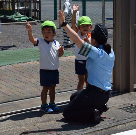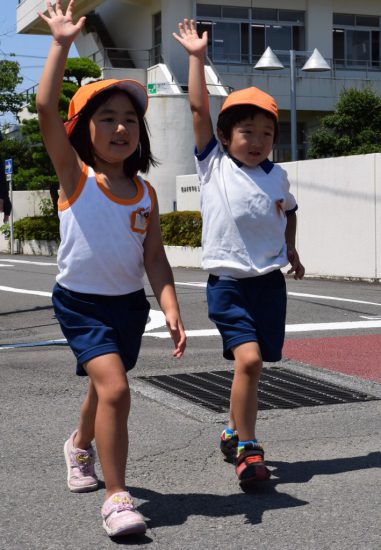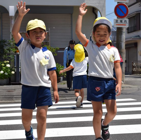 年少さんも自分で左右を確認して横断歩道を渡り、年中さん、年長さんは幼稚園から離れた交差点まで歩きます。