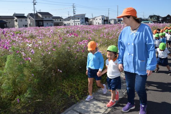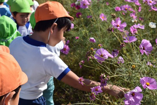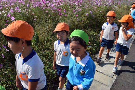 コスモスを見に行ったよ!! 2018年11月10日 共通 晴天に恵まれ、年少さん、年中さんがバスで「コスモス」を見に行ってきました バスの中からコスモスが見えると「あった~」と大喜び。 一面とてもきれいなコスモス。お花の色や形など興味津々で見ていました。 「すごいきれいだった~」とみんな大満足の様子でした。
