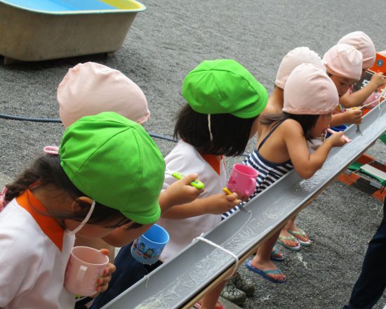 登園してきた子どもたちは園庭に準備してあるそうめんを流す竹をみて興味津々の様子。![]()