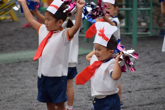 年少、年中さんの遊戯では大勢のお客さんの前でも練習してきた踊りを頑張って披露してくれました。![]()