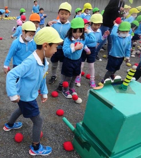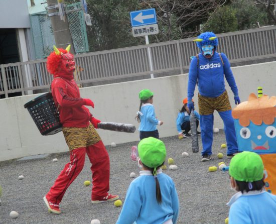 👹節分会 2020年02月07日 共通 2月3日に「節分会」を行いました 朝、幼稚園バスが到着して降りてきた子の中には「おにくるかな~」と心配そうにしている子も 始めに先生から節分の話を聞いた後、みんなで一生懸命ダンボールの鬼めがけて玉入れの玉を投げていると、、、、、 後ろから赤鬼、青鬼が登場。 びっくりしてしまった子もいましたが、年長さんを中心にみんなで鬼に向かって玉を投げ、追い払うことが出来ました。 今年も無病息災で、楽しい1年にしようね。