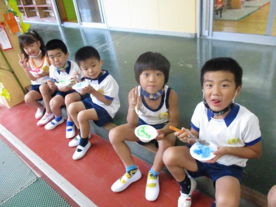 最初はカキ氷大会 みんな美味しそうに食べていました。