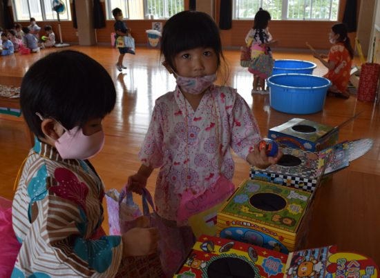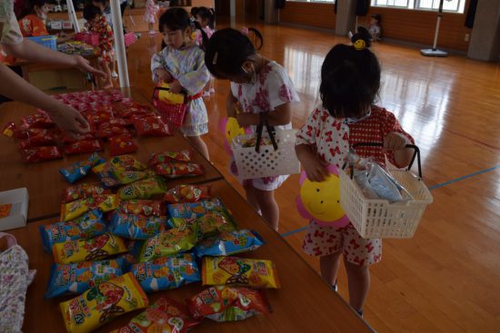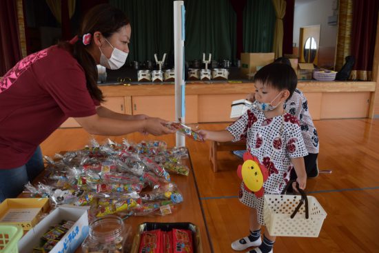 今年度はコロナウイルス感染防止のため、「バザー」「盆踊り」の実施ができない状況でしたが、保育の中で「夏のお楽しみ会」として盆踊り、お買い物ごっこを行いました![]()