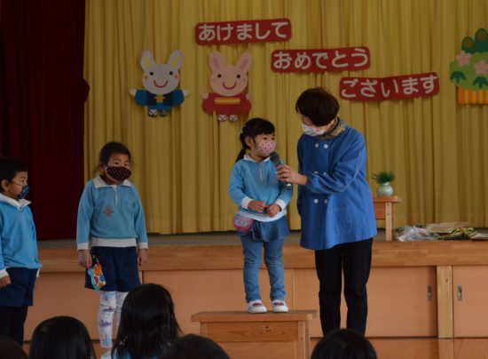 始業式では、先生からお正月のお話しや正月あそび、凧揚げや羽根突き、コマなども紹介してもらい、各クラス一人ずつ、冬休みに楽しかったことを発表しました。