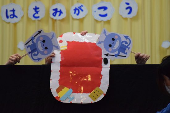 ☆虫歯予防集会☆ 2021年06月04日 共通 6月4日の「むしの日」に因んで「虫歯予防集会」を行いました。 先生から「むしの日」や虫歯について教えてもらい、子どもの歯は何本あるかクイズをしたり、みんな大きな声で答えていました 最後に先生たちのペープサート。一緒に歯の磨き方を練習したり、みんな興味津々に見入っていました。 虫歯にならないように、忘れずに毎日歯磨きを続けていこうね。