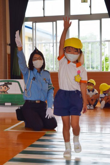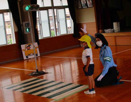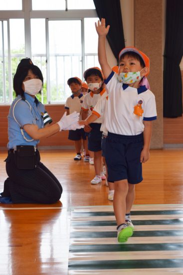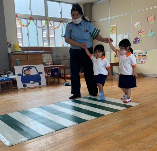 交通安全教室!! 2021年06月17日 共通 交通安全教室を行いました 信号機や横断歩道の渡り方など教えてもらい、雨天のため年少さんはクラス、年中、年長さんはホールで横断歩道を渡る練習をしました 年中、年長さんは一人ずつ信号機を見て安全を確認してから渡ることができました。 今日覚えたことを忘れずに、交通安全を守っていこうね