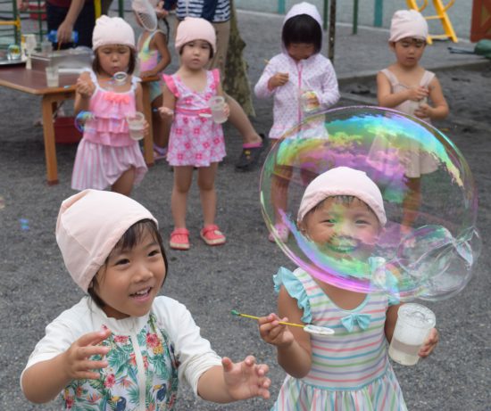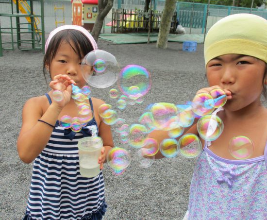 シャボン玉あそびでは、年少さんも自分たちでシャボン玉に挑戦「きれいにできた~~」と空に向かってたくさんシャボン玉をつくっていました。