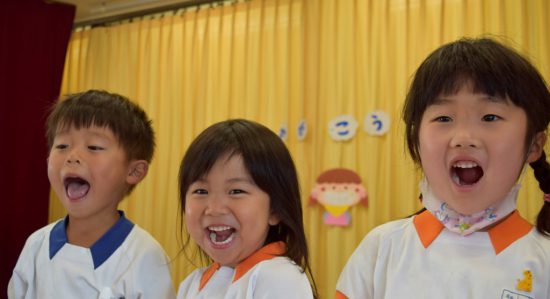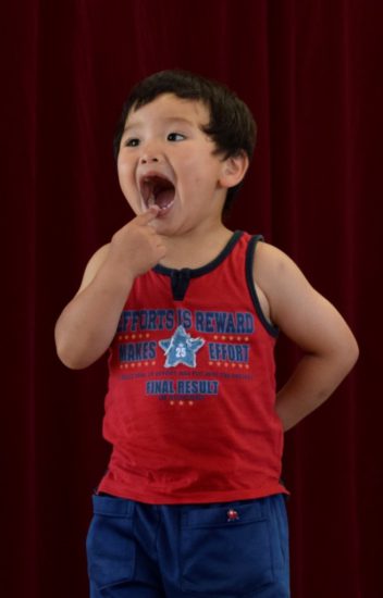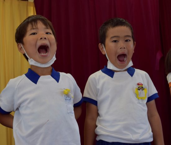 最後に先生たちの寸劇を見て、歯磨きの仕方を一緒に練習。