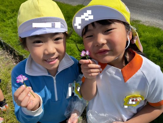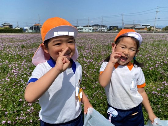 🌸蓮華畑🌸 2023年04月14日 共通 年中、年長さんが新しいクラスになり、初めての園外保育に出かけました バスに乗って出発。 ひかり組、ほし組で「蓮華畑」に行ってきました。 友だちと一緒に蓮華をとったり、みんなで一面に咲く蓮華を見てきました。 幼稚園に帰ってきたみんなの袋には蓮華がたくさん入っていて「れんげきれいだったよ」「バスに乗れて楽しかった」と大満足の様子でした。