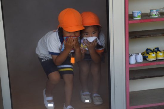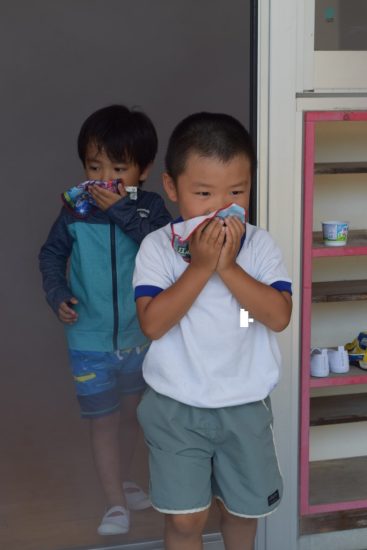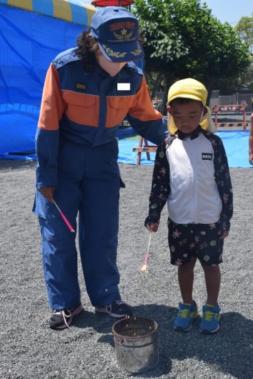 花火の約束を消防士さんたちから教えてもらった後に煙体験のスタート
