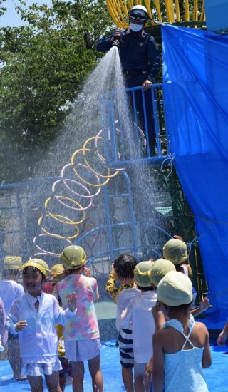 最後は消防車から放水をしてもらい、とても暑い日だったのでみんな気持ちよさそうに水あそびを楽しんでいました。