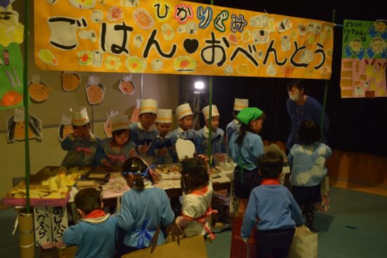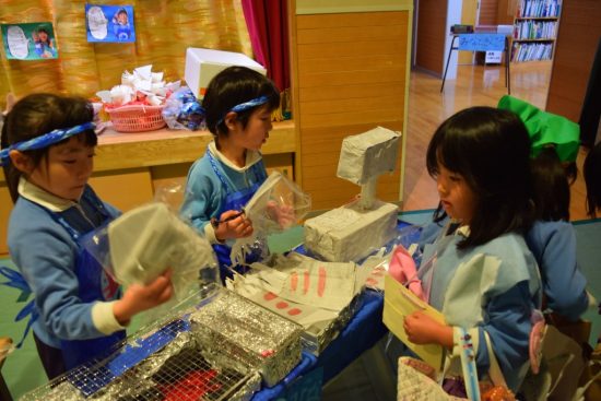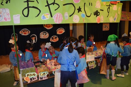 お店やさんごっこ!! 2024年02月22日 共通 ホールに各クラスでつくった「お店やさん」お客さん、お店の店員さんにわかれて「お店やさんごっこ」を行いました お店から「いらっしゃいませ~~」と大きな声でお客さんを呼ぶ声が響いていました。 自分のお財布にお金を入れて、お店で美味しそうなお菓子やお惣菜、お肉やお魚などを袋いっぱいにお買い物 みんな大満足でお店やさんごっこを行うことができました。