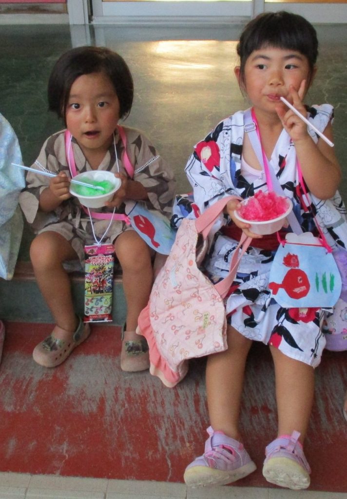 🌟盆踊り🌟 2025年07月11日 共通 みなと幼稚園で毎年恒例の盆踊りを行いました❗❗盆踊りの前には、お菓子やくじ引き、光る玩具をお買い物👍👍自分のお財布に金券を入れて売り場を回ります❗❗カキ氷では美味しそうに食べていました😋 楽しみにしていた盆踊り、今年は天気も良くグラウンドで櫓の太鼓に合わせてみんなで踊りました👍😆👍練習した曲の中から、みんなで好きな曲を決めて踊ります😁「もったいないばあさん音頭」「たこやき音頭」「勇気音頭」最後はお父さん、お母さんも一緒に踊ってみんな大満足の様子でした✨😄✨