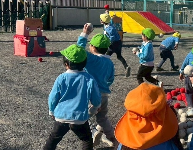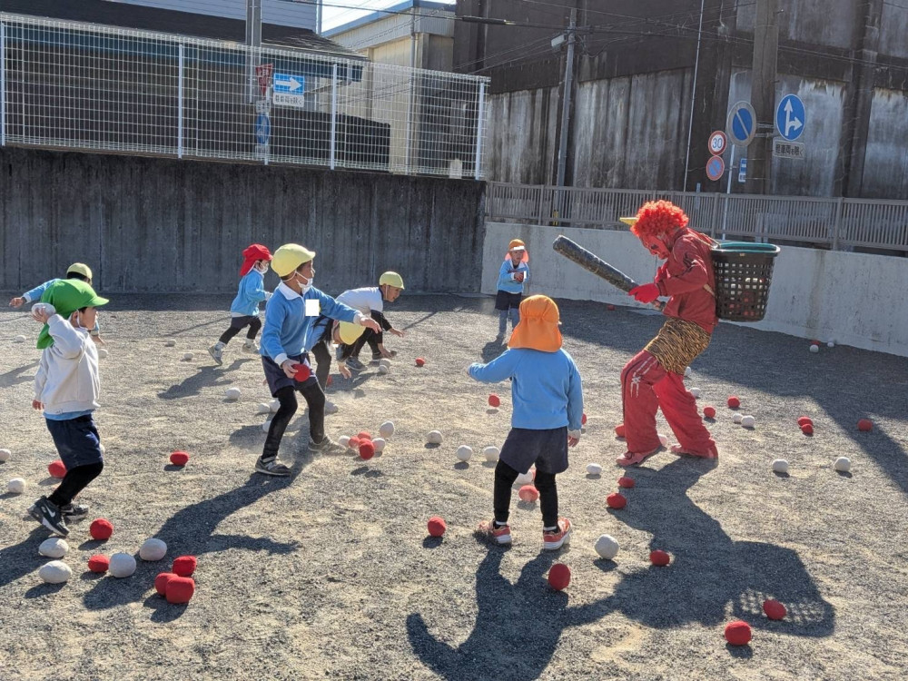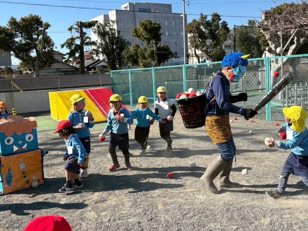 節分会をしたよ!! 2026年02月04日 共通 今日は👹節分会👹でした❗お集まりをして節分の紙芝居を見たり、鬼の嫌いな柊の葉やめざしについても教えてもらいました❗❗ダンボールで作った鬼にボールを当てるゲームを楽しんでいると後ろから👹鬼👹が😅😅すぐに鬼に向かってボールを投げている子がたくさんいました🌟👍👹👍🌟「鬼は外❗」と大きな声で言いながらボールを投げている子も✨✨怖かった子もよく頑張りました👍😁👍午後にお部屋の中で豆まきもしましたよ❗❗帰りは家にも鬼が来るかな❓という話で子どもたちは盛り上がっていました😆